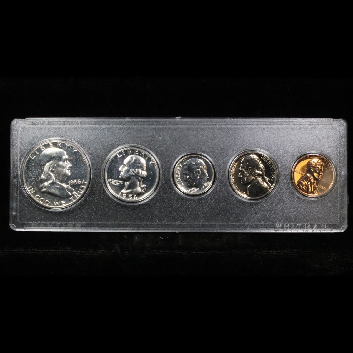 1956 United States Proof Set in Whitman Plastic Holder. A nice 1956 United States Proof Set. Includes a proof Franklin Half dollar, a proof Washington Quarter, a proof Roosevelt dime, a proof Jefferson nickel and a proof Lincoln cent. All encased in a Whitman Plastic Holder.