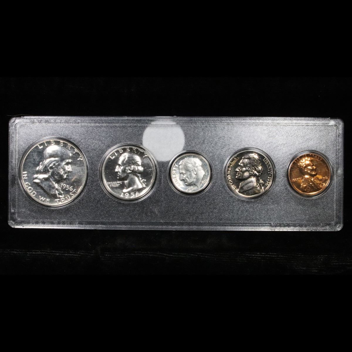 1956 United States Proof Set in Whitman Plastic Holder. This set, has a 90% Proof Silver Franklin Half Dollar, a 90% Proof Silver Quarter, a 90% Proof Silver Dime, plus the proof nickel and proof penny. All encased in a Whitman Plastic Holder.