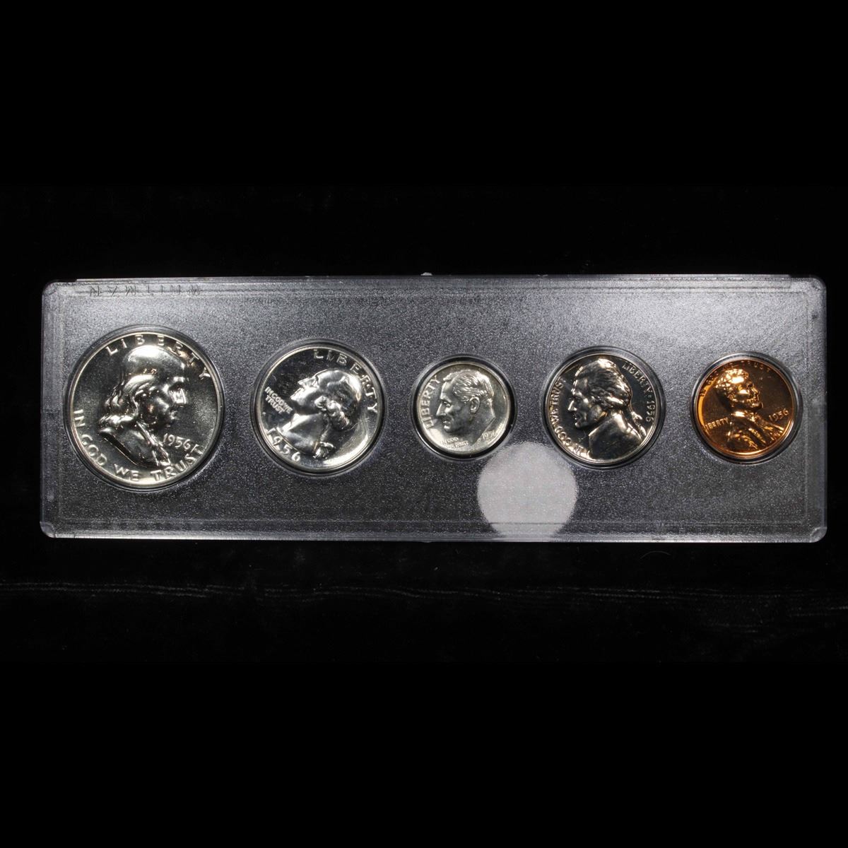 1956 United States Proof Set in Whitman Plastic Holder. This set, has a 90% Proof Silver Franklin Half Dollar, a 90% Proof Silver Quarter, a 90% Proof Silver Dime, plus the proof nickel and proof penny. All encased in a Whitman Plastic Holder.