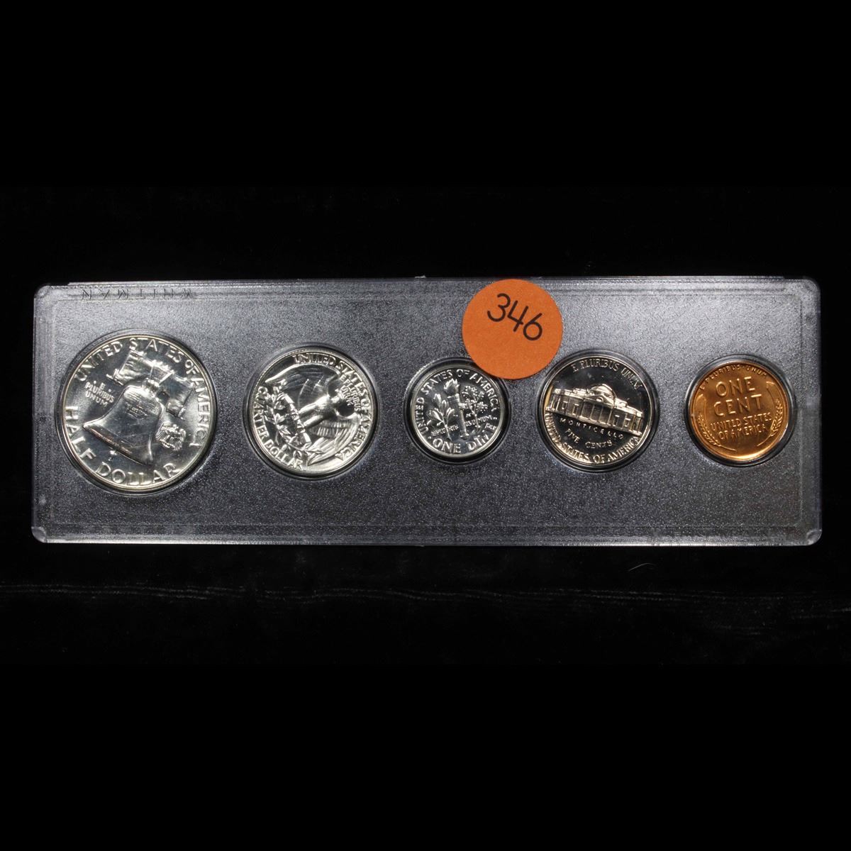 1956 United States Proof Set in Whitman Plastic Holder. This set, has a 90% Proof Silver Franklin Half Dollar, a 90% Proof Silver Quarter, a 90% Proof Silver Dime, plus the proof nickel and proof penny. All encased in a Whitman Plastic Holder.