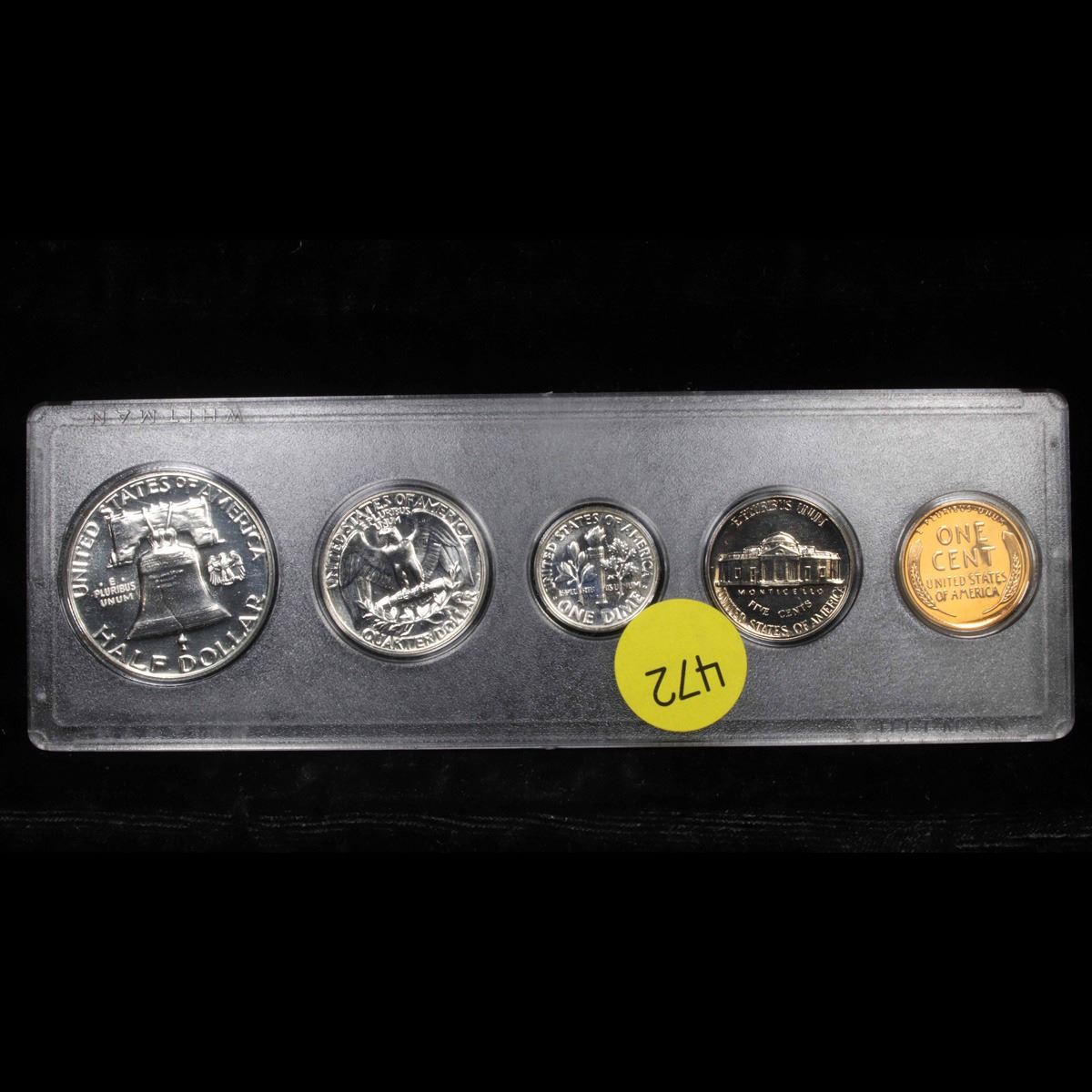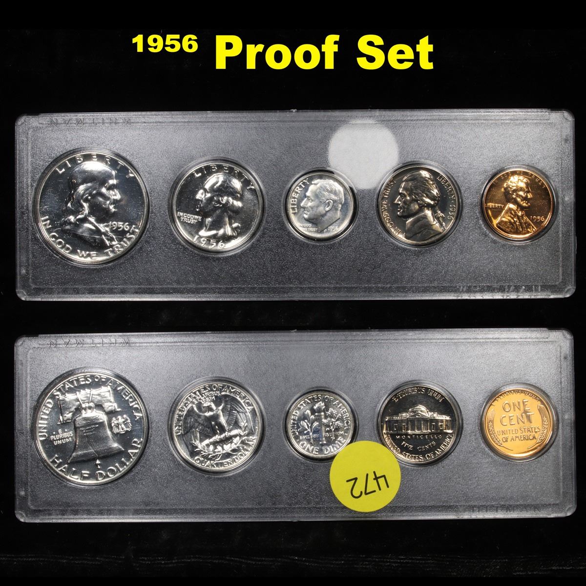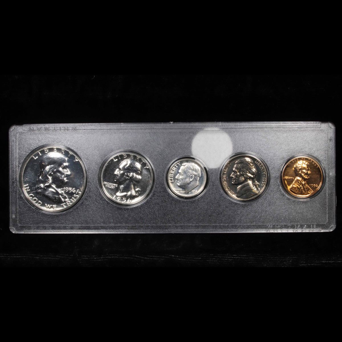 1956 United States Proof Set in Whitman Plastic Holder. This set, has a 90% Proof Silver Franklin Half Dollar, a 90% Proof Silver Quarter, a 90% Proof Silver Dime, plus the proof nickel and proof penny. All encased in a Whitman Plastic Holder.