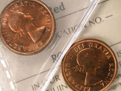 Canada Cent 1956 and 1959, both ICCS MS-65 Red, and both about 90% red