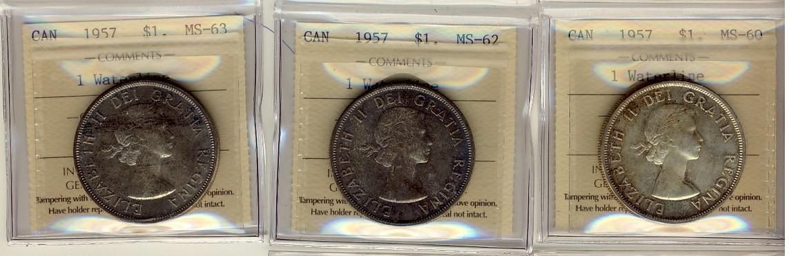 1957 $1 1 WL. Lot of 3 coins all ICCS graded includes MS60, MS62 & MS63.