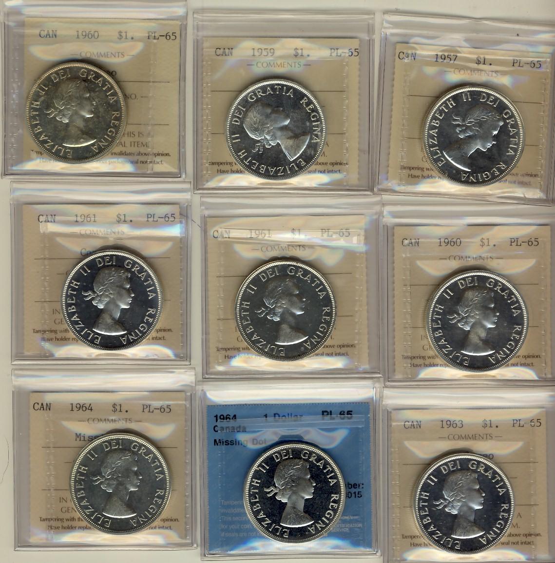 1957 $1,1959, 1960(2), 1961(2), 1963 & 1964 Missing Dot(2) PL65. Lot of 8 coins all ICCS graded except one CCCS. Cameo designations included.