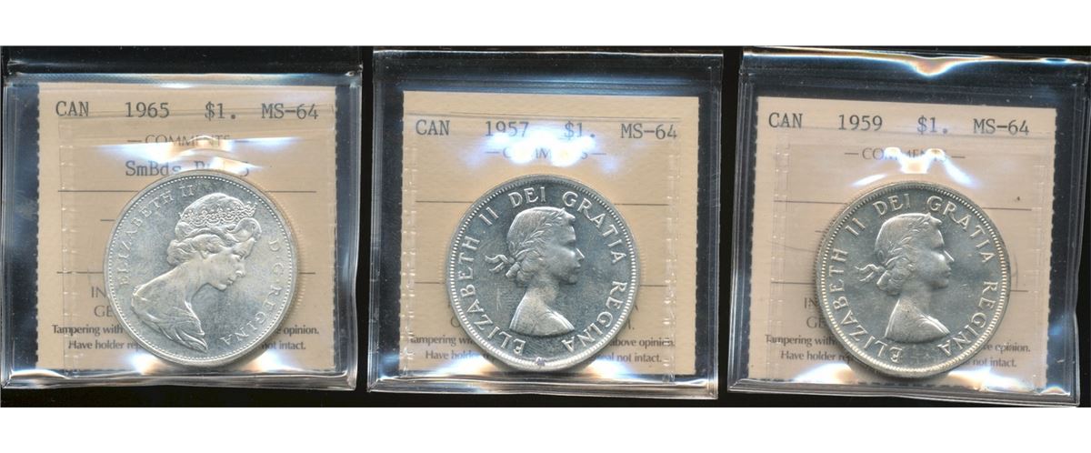 1957 $1. 1959 & 1964 SmBds Blt ICCS MS64. Lot of 3 coins.
