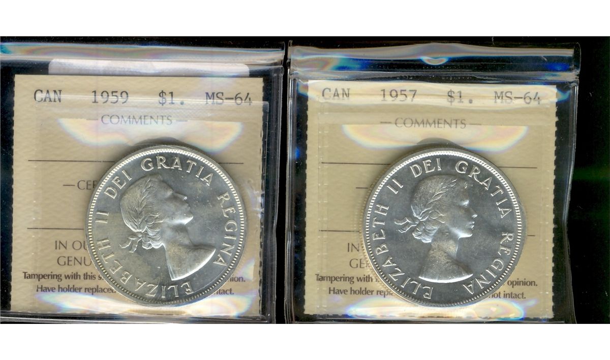 1957 $1 & 1959 ICCS MS64. Lot of 2 coins.