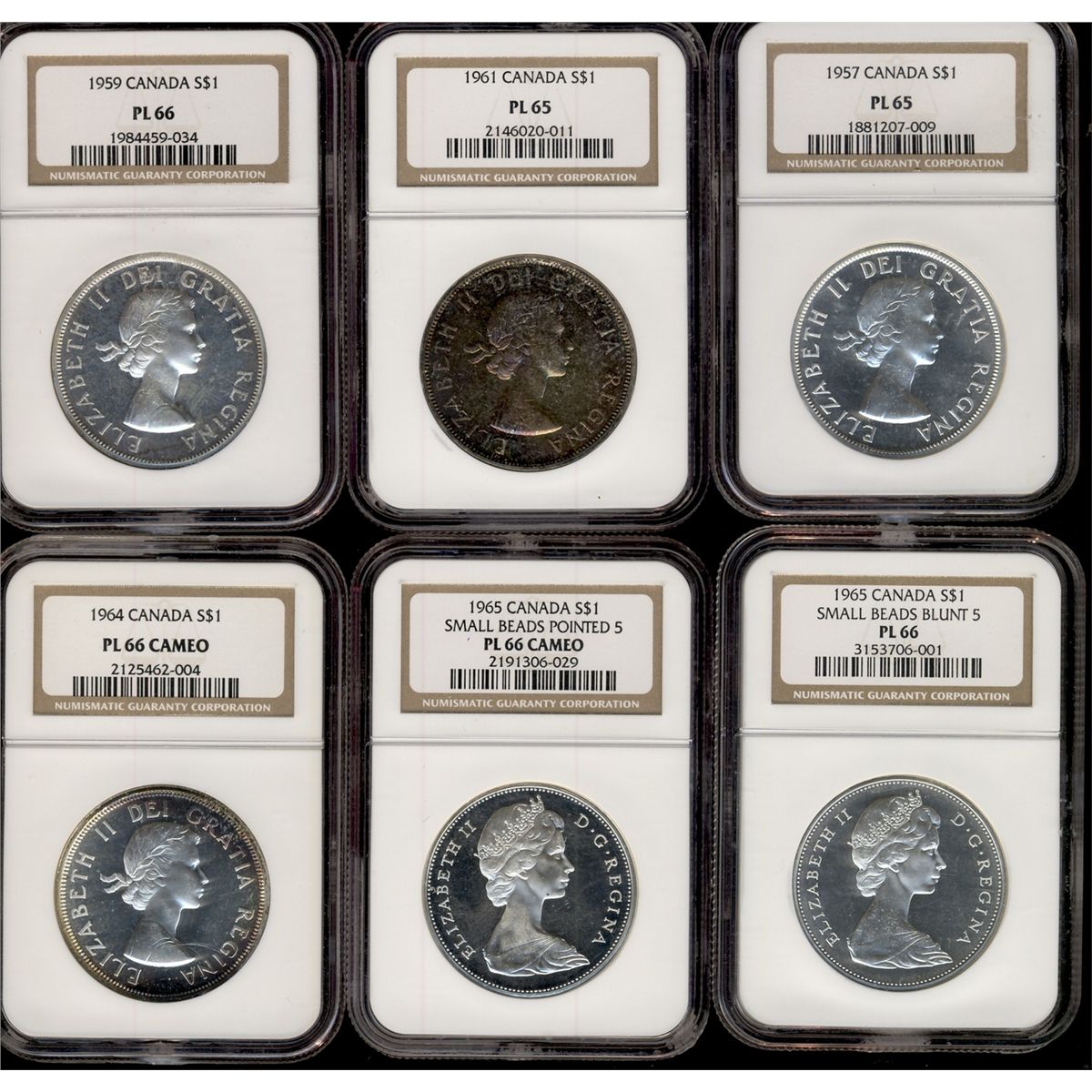 1957 $1, 1961 PL65 & 1959, 1964, 1965 T1 & 1965 T2 PL66. Lot of 6NGC graded coins.