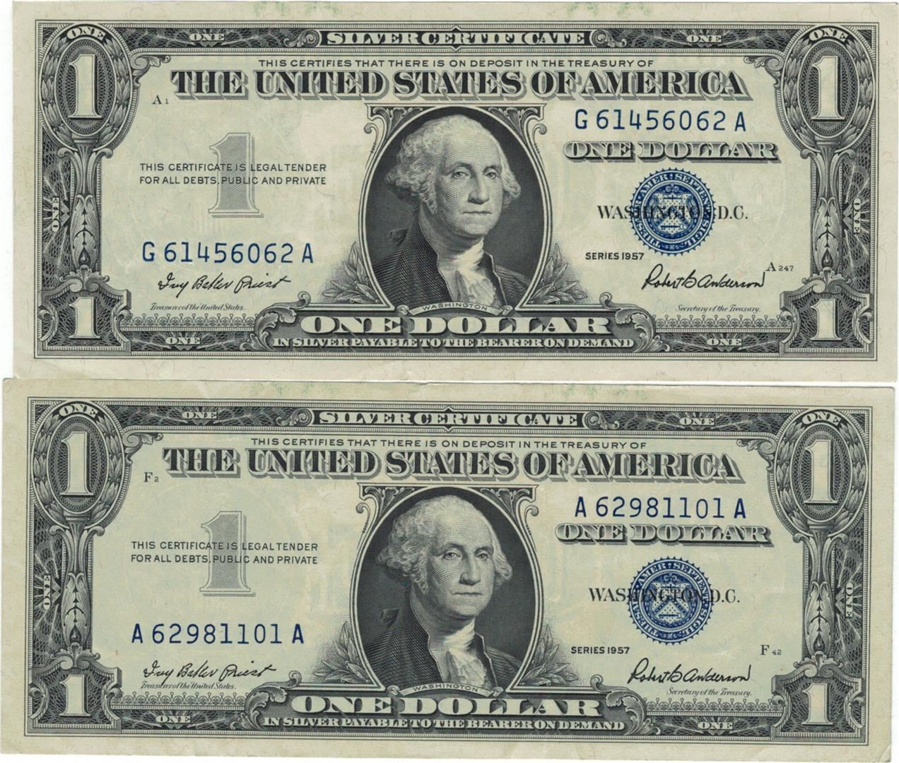 One 1957 $1 AU/Unc Silver Certificate Currency Lot of 2.
