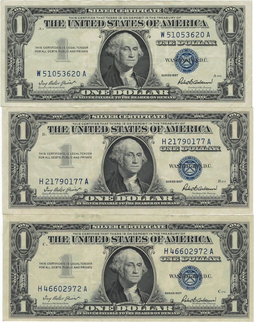 One 1957 $1 AU/Unc Silver Certificate Currency Lot of 3.