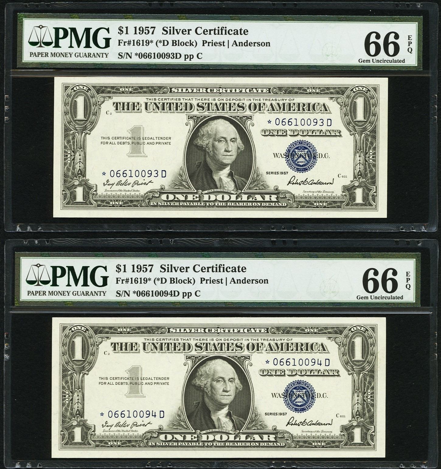 Lot of (2) 1957 $1 Consecutive Serial Silver Certificate STAR Notes PMG 66EPQ.