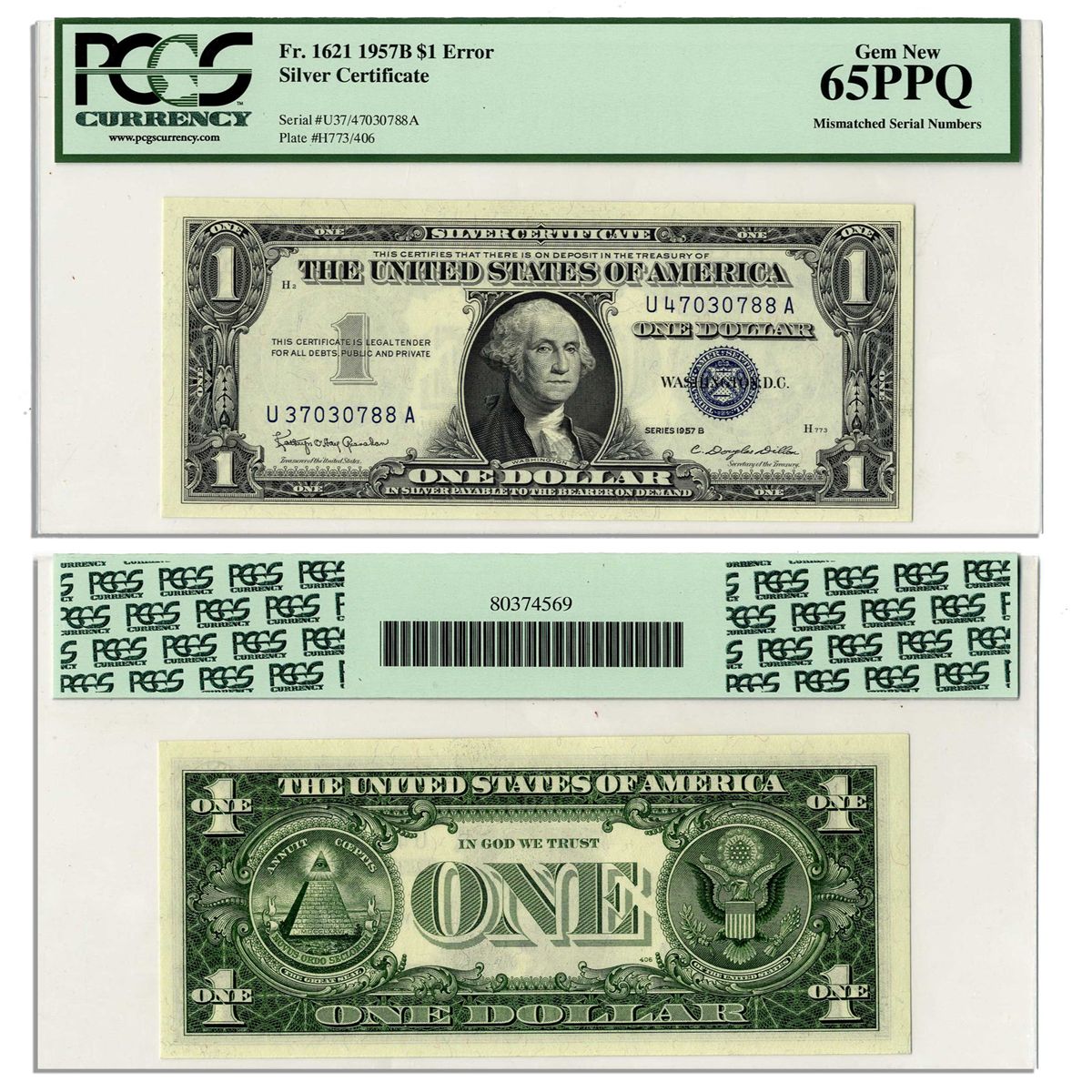 $1 Federal Reserve Silver Certificate Error Note -- Series 1957-B -- Graded PCGS 65PPQ