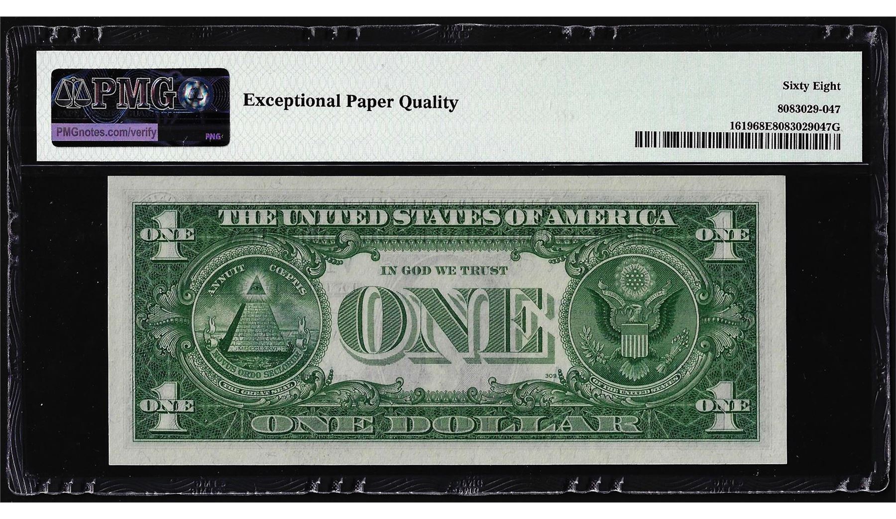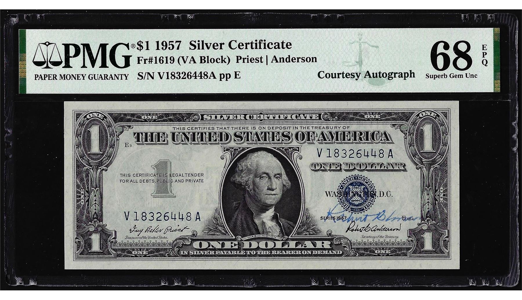 One 1957 $1 Funnyback Silver Certificate Note w/ Courtesy Auto PMG Superb Gem Unc 68EPQ. PMG Certified.