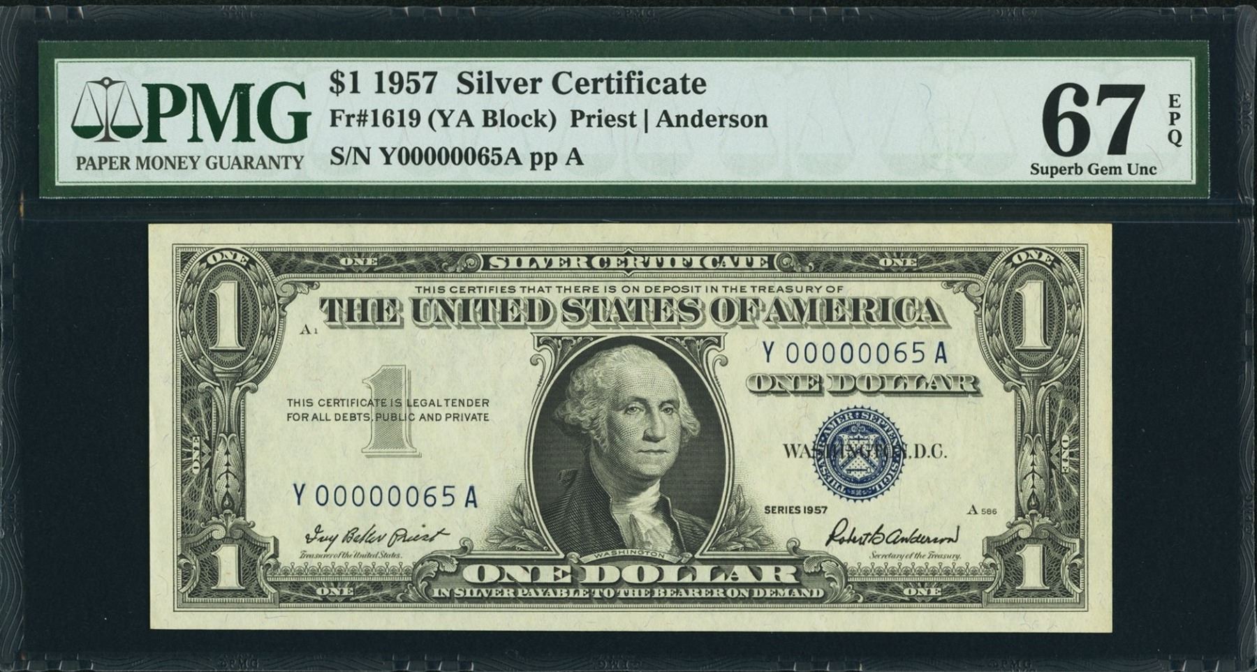 One 1957 $1 Low Serial Silver Certificate PMG 67EPQ.