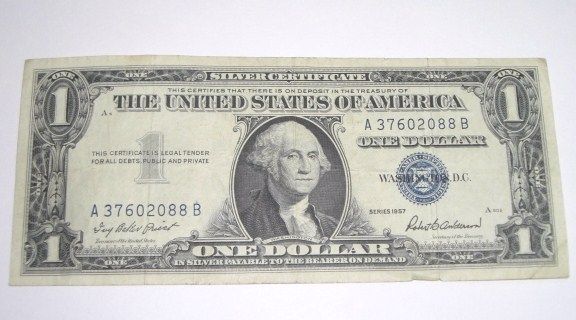 1957 $1 SILVER CERTIFICATE U.S. BILL SERIAL # A37602088B *NICE BILL PLEASE LOOK AT PICTURE TO DETERMINE GRADE*!! ***Coin, Currency & All Items Listed in this auction - Grades, Conditions and Values are not Safe Deposit Coins LLC Responsibilty. Grades, Condition and Values are determined by Consigner(s) & Buyers ONLY