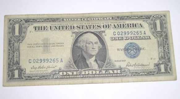 1957 $1 SILVER CERTIFICATE U.S. BILL SERIAL # C02999265A *NICE BILL PLEASE LOOK AT PICTURE TO DETERMINE GRADE*!! ***Coin, Currency & All Items Listed in this auction - Grades, Conditions and Values are not Safe Deposit Coins LLC Responsibilty. Grades, Condition and Values are determined by Consigner(s) & Buyers ONLY