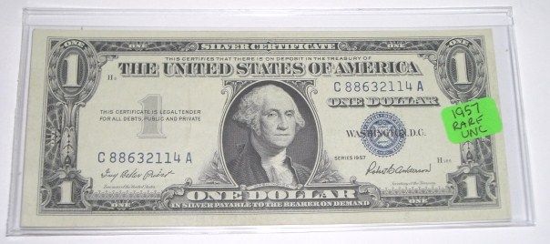 1957 $1 SILVER CERTIFICATE U.S. BILL SERIAL # C88632114A *EXTREMELY RARE UNC HIGH GRADE*!! ***Coin, Currency & All Items Listed in this auction - Grades, Conditions and Values are not Safe Deposit Coins LLC Responsibilty. Grades, Condition and Values are determined by Consigner(s) & Buyers ONLY