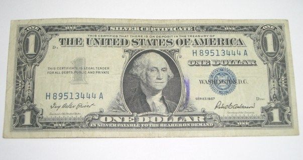 1957 $1 SILVER CERTIFICATE U.S. BILL SERIAL # H89513444A *NICE BILL PLEASE LOOK AT PICTURE TO DETERMINE GRADE*!! ***Coin, Currency & All Items Listed in this auction - Grades, Conditions and Values are not Safe Deposit Coins LLC Responsibilty. Grades, Condition and Values are determined by Consigner(s) & Buyers ONLY