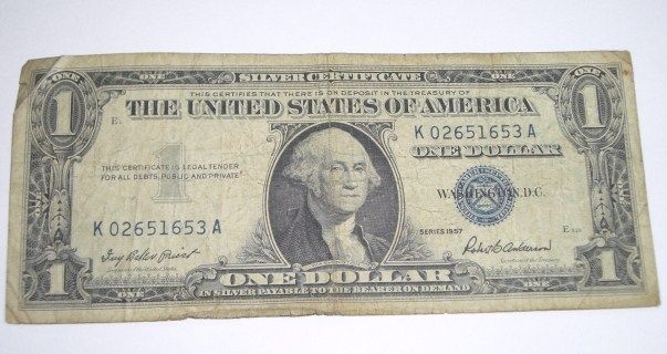 1957 $1 SILVER CERTIFICATE U.S. BILL SERIAL # K02651653A *NICE BILL PLEASE LOOK AT PICTURE TO DETERMINE GRADE*!! ***Coin, Currency & All Items Listed in this auction - Grades, Conditions and Values are not Safe Deposit Coins LLC Responsibilty. Grades, Condition and Values are determined by Consigner(s) & Buyers ONLY