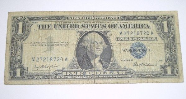 1957 $1 SILVER CERTIFICATE U.S. BILL SERIAL # V27218720A *NICE BILL PLEASE LOOK AT PICTURE TO DETERMINE GRADE*!! ***Coin, Currency & All Items Listed in this auction - Grades, Conditions and Values are not Safe Deposit Coins LLC Responsibilty. Grades, Condition and Values are determined by Consigner(s) & Buyers ONLY