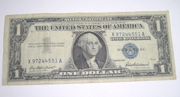 1957 $1 SILVER CERTIFICATE U.S. BILL SERIAL # X97244551A *NICE BILL PLEASE LOOK AT PICTURE TO DETERMINE GRADE*!! ***Coin, Currency & All Items Listed in this auction - Grades, Conditions and Values are not Safe Deposit Coins LLC Responsibilty. Grades, Condition and Values are determined by Consigner(s) & Buyers ONLY