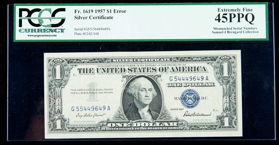 1957, $1 Silver Certificate. Mismatched Serial Numbers. PCGS Extremely Fine 45PPQ. . Fr-1619. A nice, lightly circulated example of the G55/54 mismatch.
