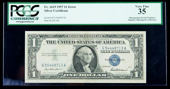 1957, $1 Silver Certificate. Mismatched Serial Numbers. PCGS Very Fine 35. . Fr-1619. G55/54 mismatch.