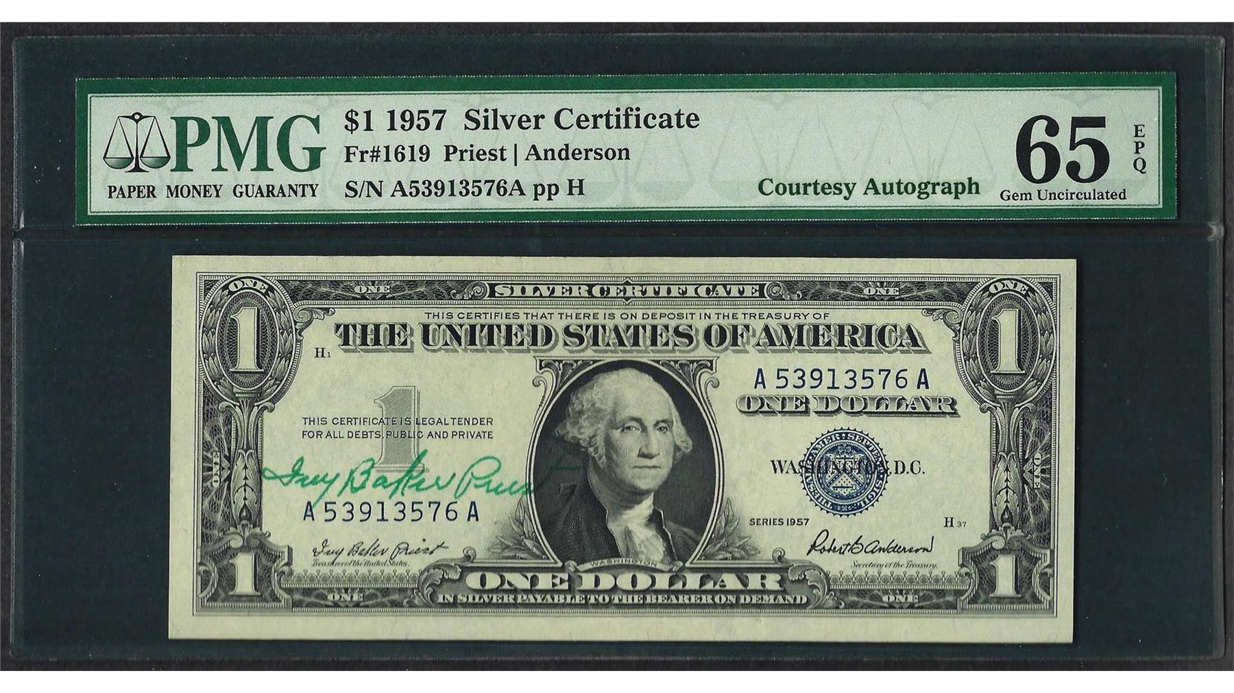 One 1957 $1 Silver Certificate Note Fr.1619 Courtesy Autograph PMG Gem Uncirculated 65EPQ. PMG Certified.