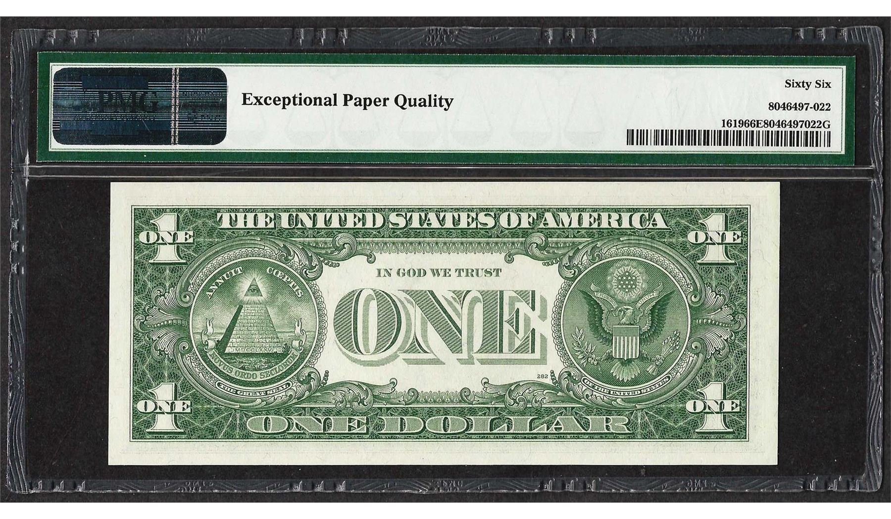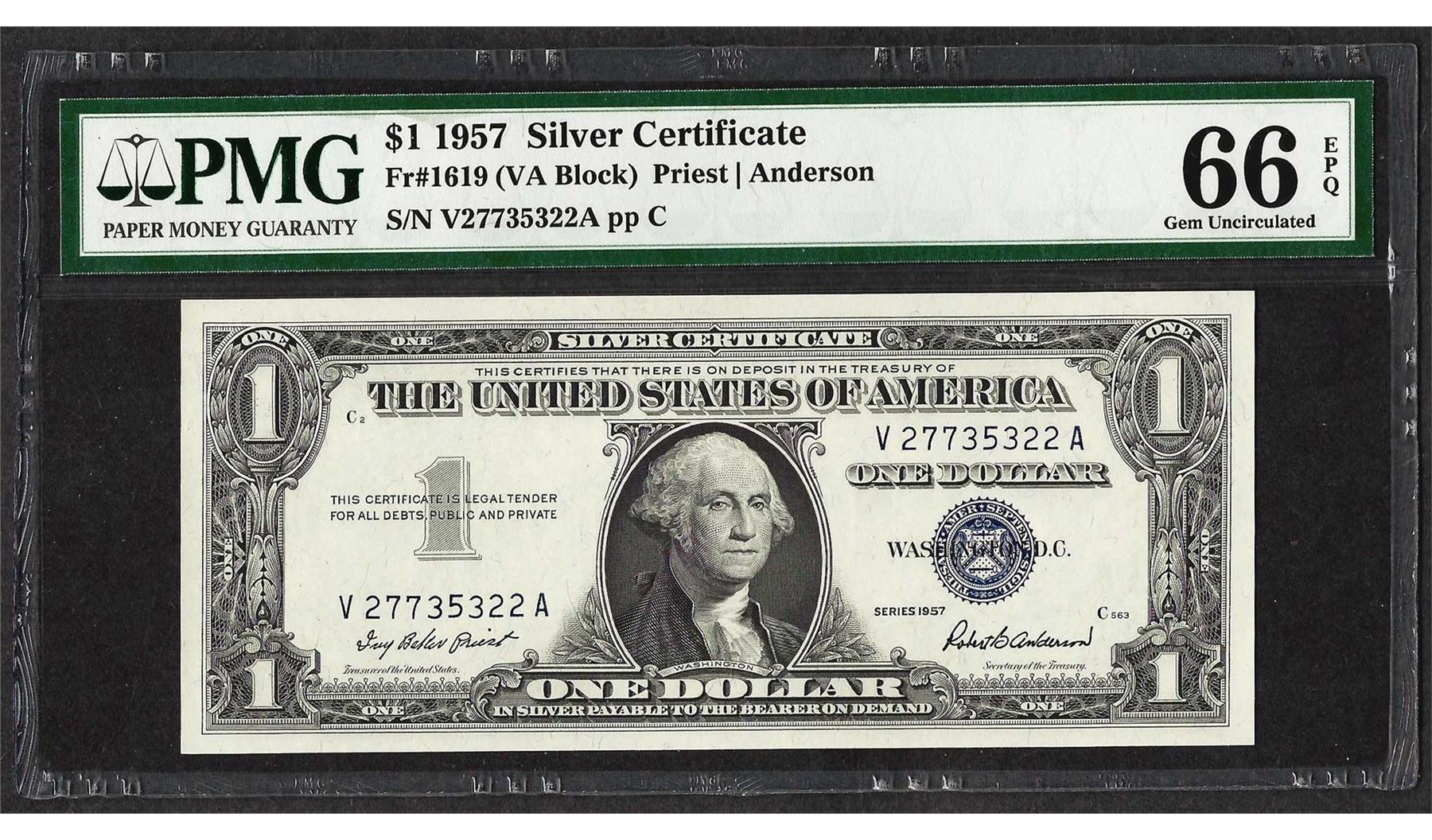 One 1957 $1 Silver Certificate Note Fr.1619 PMG Gem Uncirculated 66EPQ. PMG Certified.