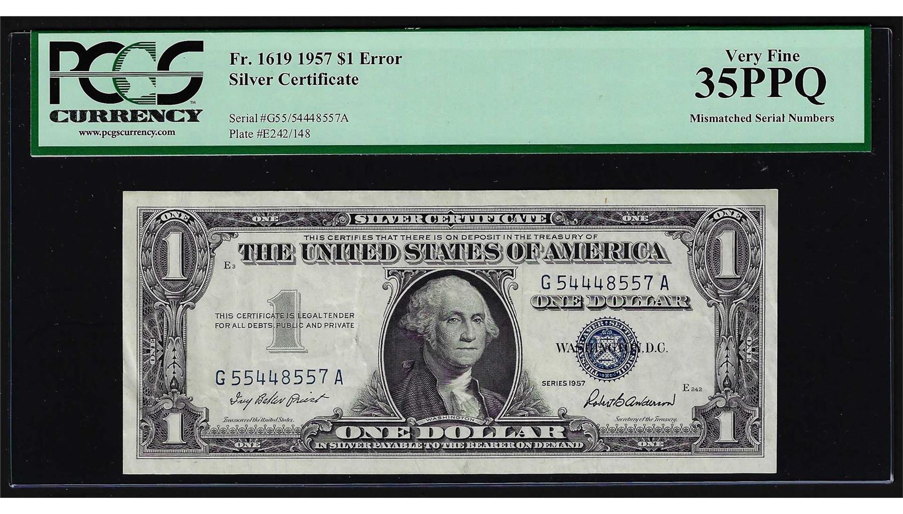 1957 $1 Silver Certificate Note Mismatch Serial Number ERROR PCGS Very Fine 35PP
