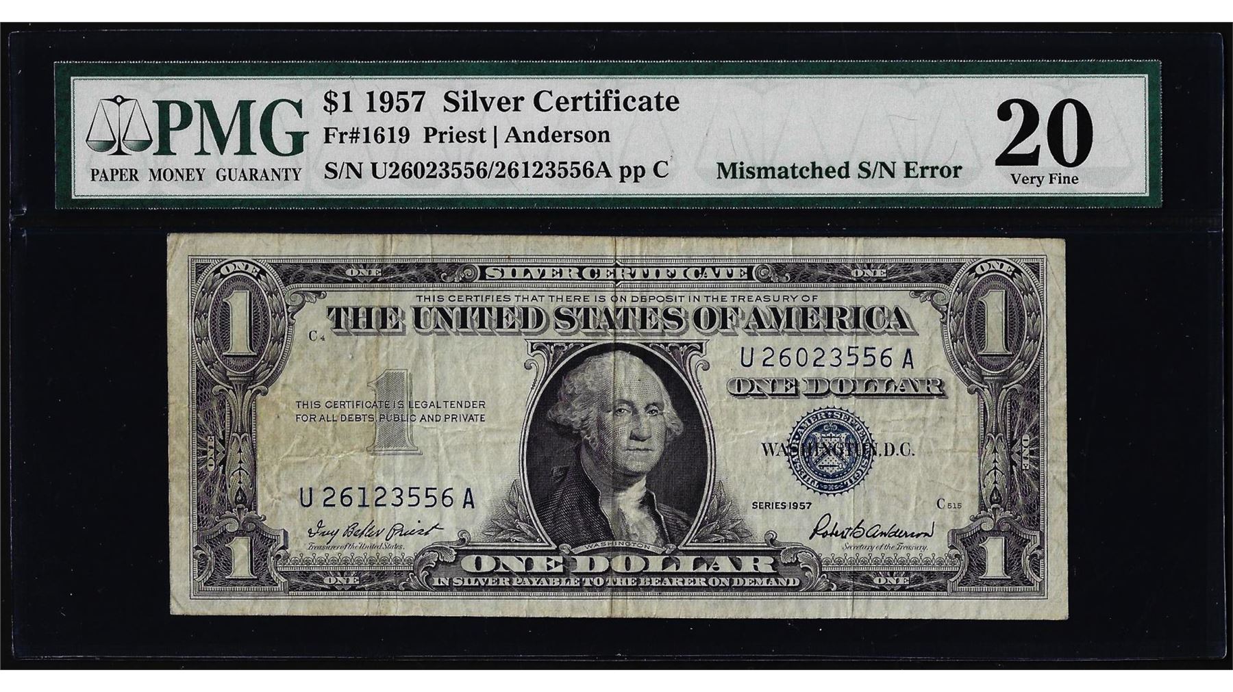 One 1957 $1 Silver Certificate Note Mismatched Serial Number Error Fr.1619 PMG Very Fine 20. PMG Certified.