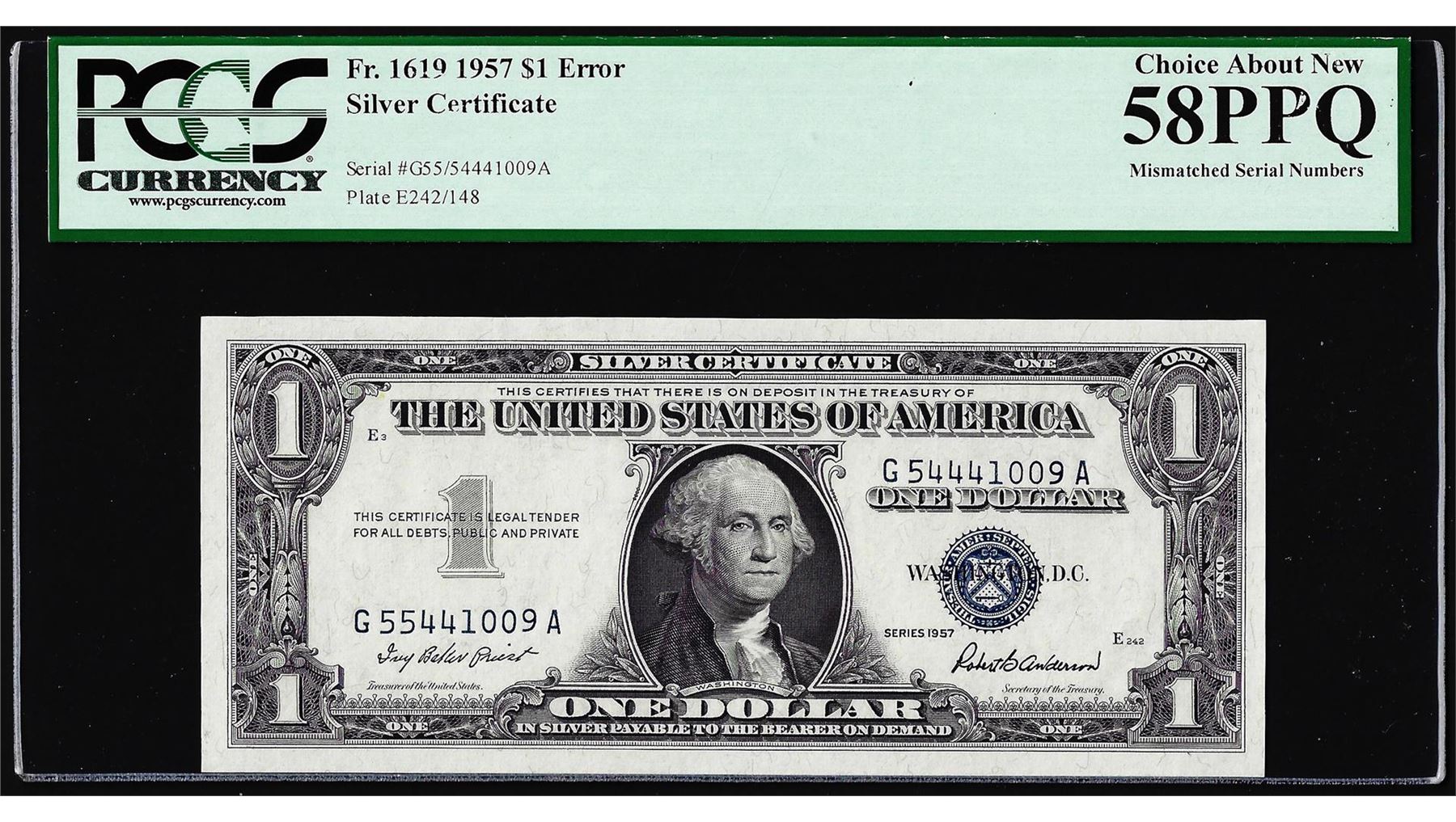 1957 $1 Silver Certificate Note Mismatched Serial Number Error PCGS Ch. About New 58PPQ