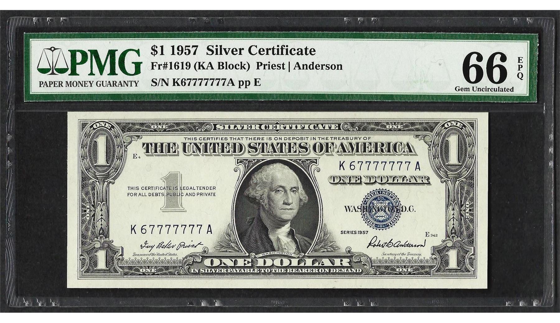 1957 $1 Silver Certificate Note Near Solid Serial 7's PMG Gem Uncirculated 66EPQ
