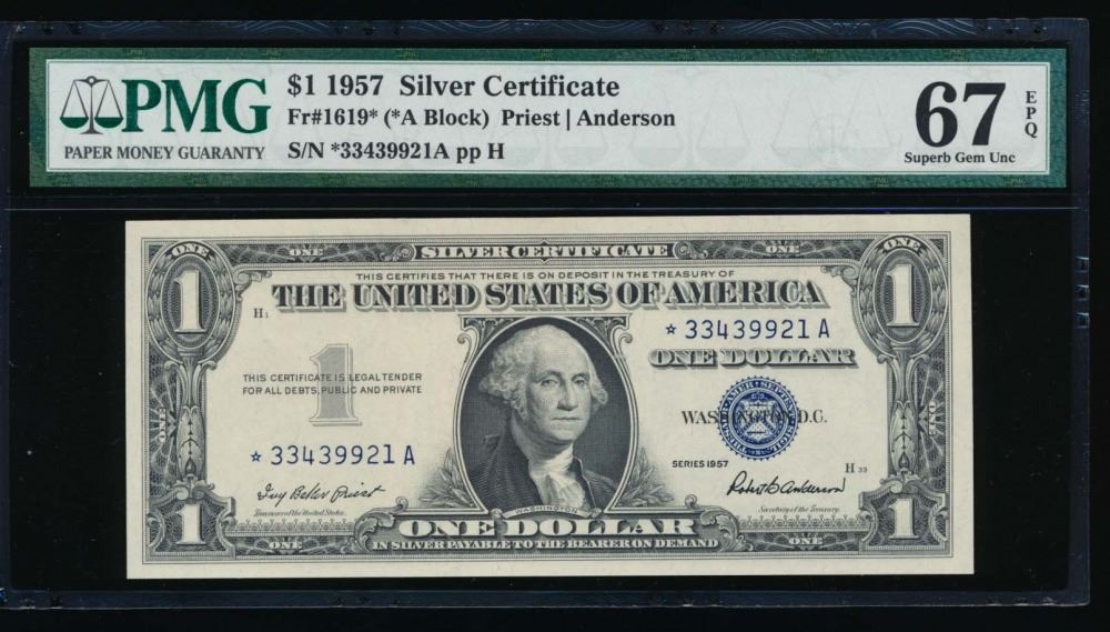 One 1957 $1 Silver Certificate STAR Note PMG 67EPQ.