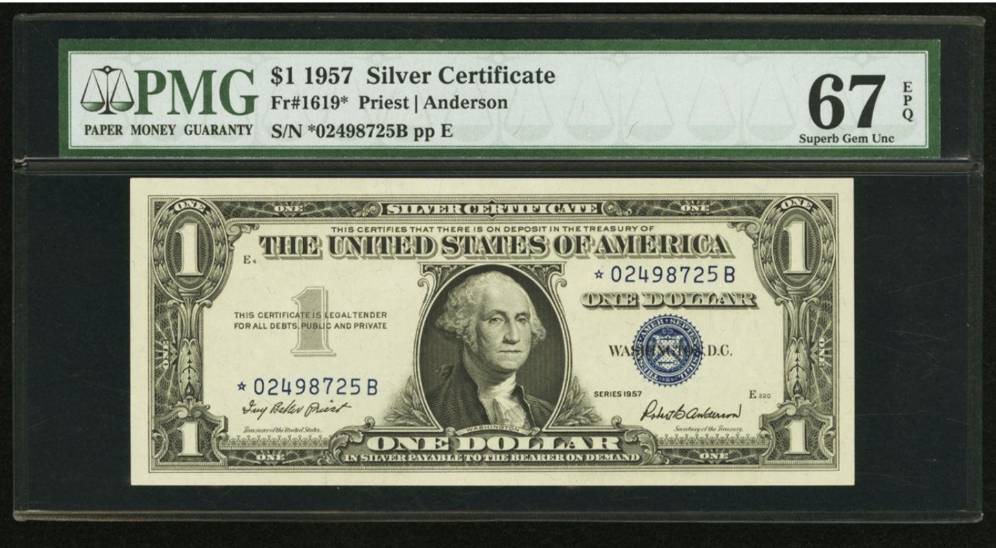 One 1957 $1 Silver Certificate STAR Note PMG 67EPQ.
