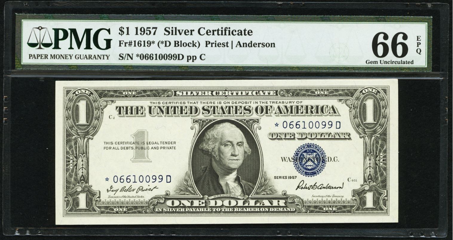 One 1957 $1 Silver Certificate STAR Note PMG 67EPQ.