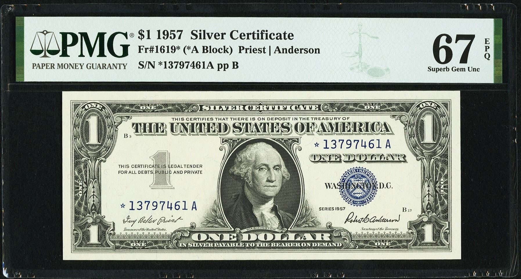One 1957 $1 Silver Certificate STAR Note PMG 67EPQ.