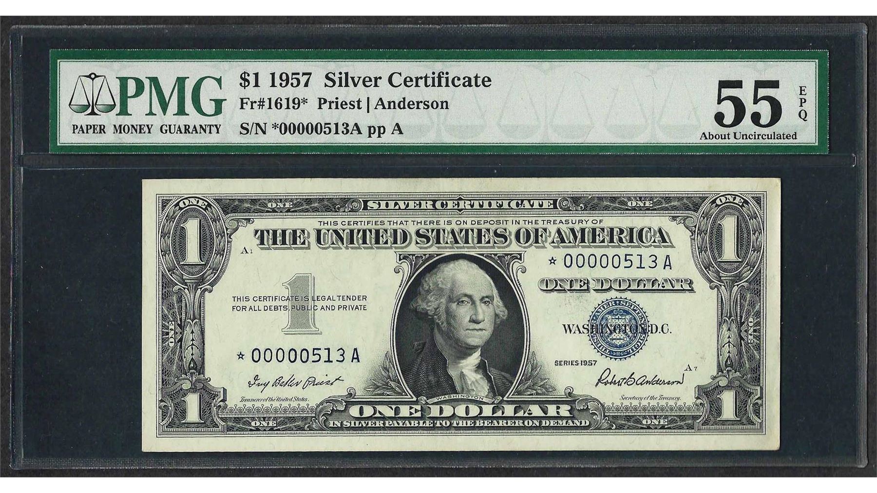 1957 $1 Silver Certificate STAR Note PMG About Uncirculated 55EPQ LOW SERIAL