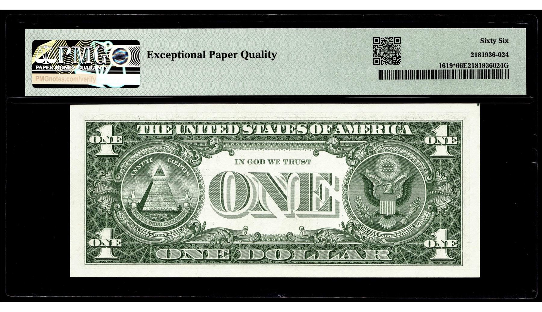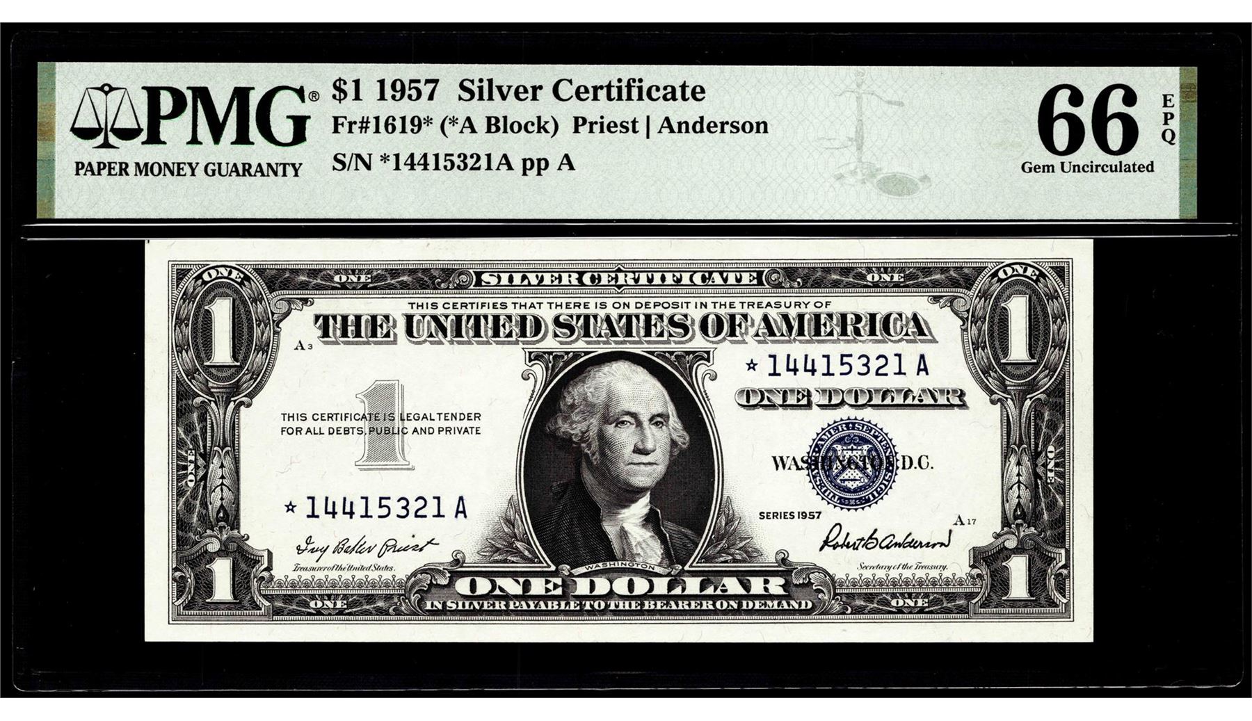 One 1957 $1 Silver Certificate Star Note Fr.1619* PMG Gem Uncirculated 66EPQ. PMG Certified.