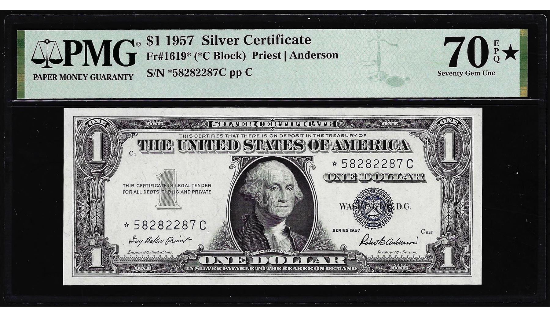 One 1957 $1 Silver Certificate Star Note Fr.1619* PMG Seventy Gem Uncirculated 70EPQ*. PMG Certified.