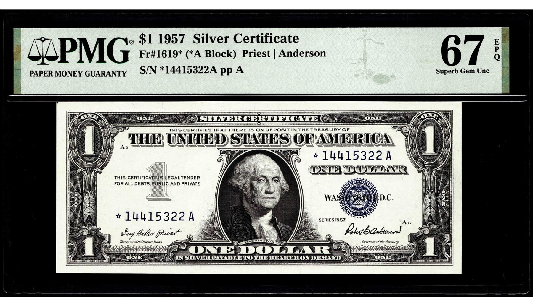 One 1957 $1 Silver Certificate Star Note Fr.1619* PMG Superb Gem Uncirculated 67EPQ. PMG Certified.
