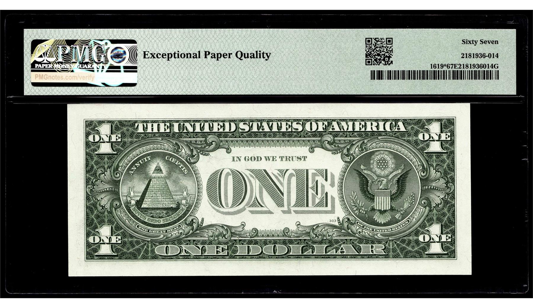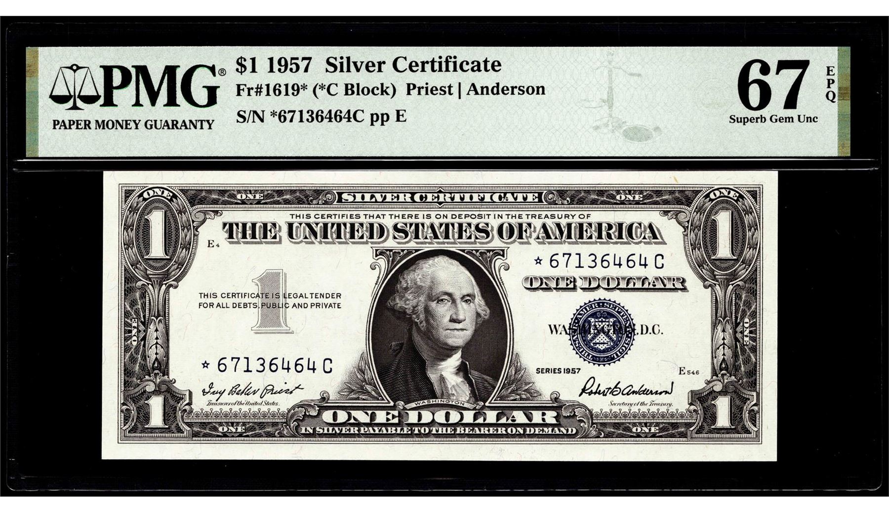 One 1957 $1 Silver Certificate Star Note Fr.1619* PMG Superb Gem Uncirculated 67EPQ. PMG Certified.