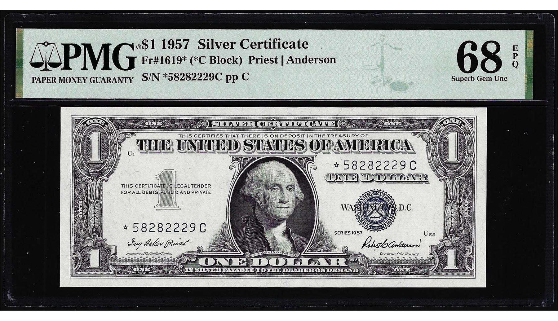 One 1957 $1 Silver Certificate Star Note Fr.1619* PMG Superb Gem Uncirculated 68EPQ. PMG Certified.