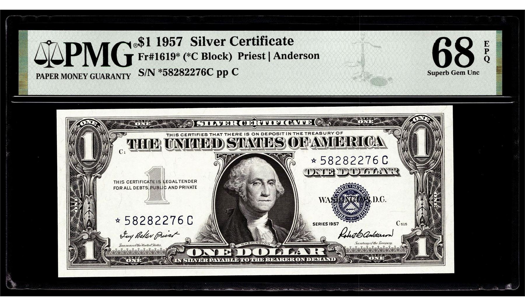 One 1957 $1 Silver Certificate Star Note Fr.1619* PMG Superb Gem Uncirculated 68EPQ. PMG Certified.