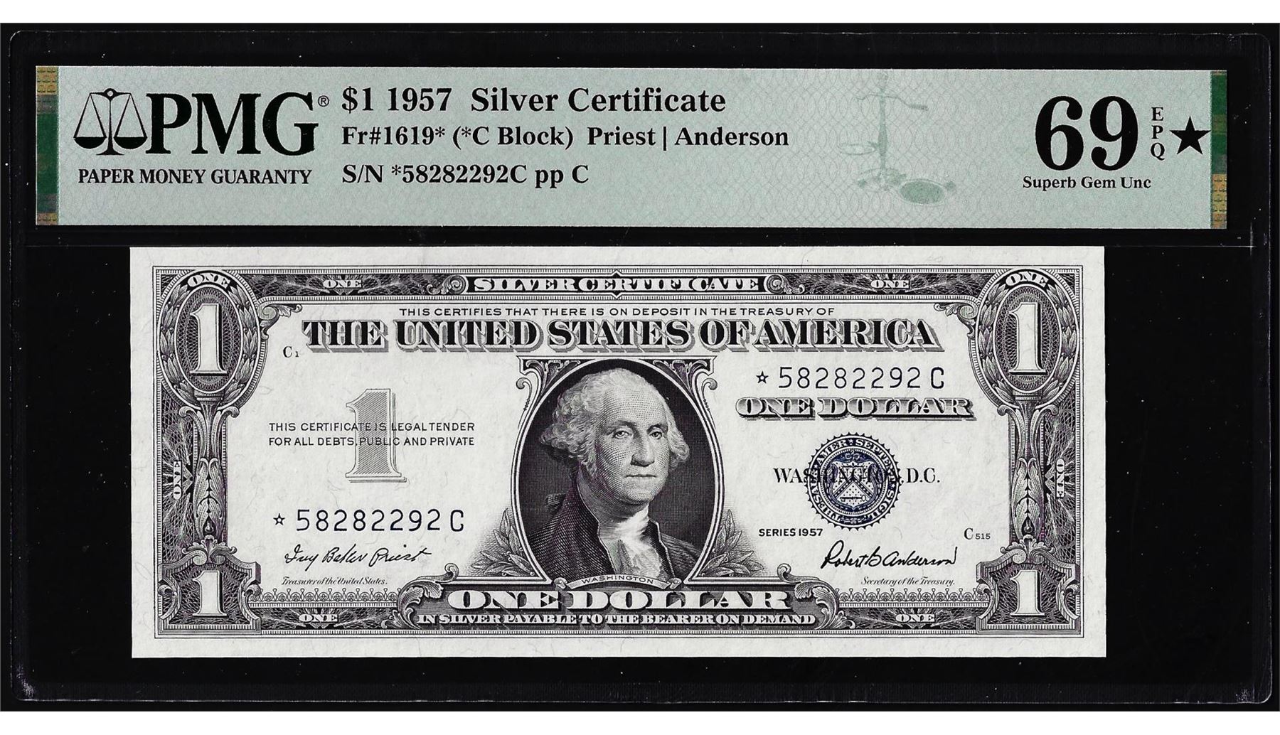 One 1957 $1 Silver Certificate Star Note Fr.1619* PMG Superb Gem Uncirculated 69EPQ STAR. PMG Certified.