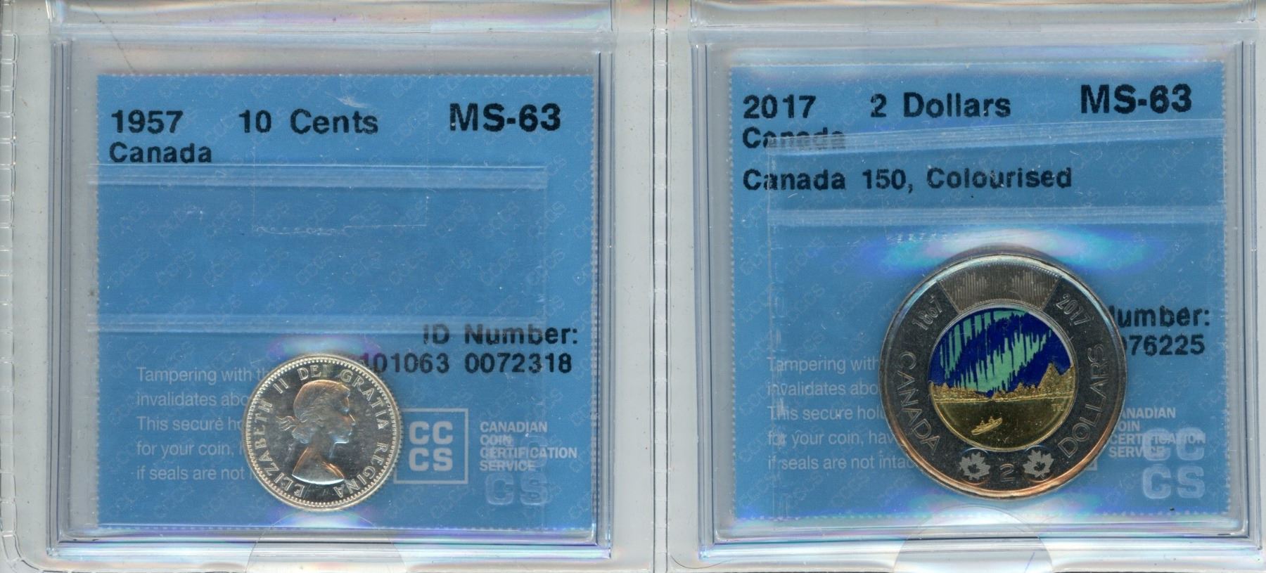 1957 10 Cent (MS-63) 2017 $2 Coin Canada 150 Colorized (MS-63)