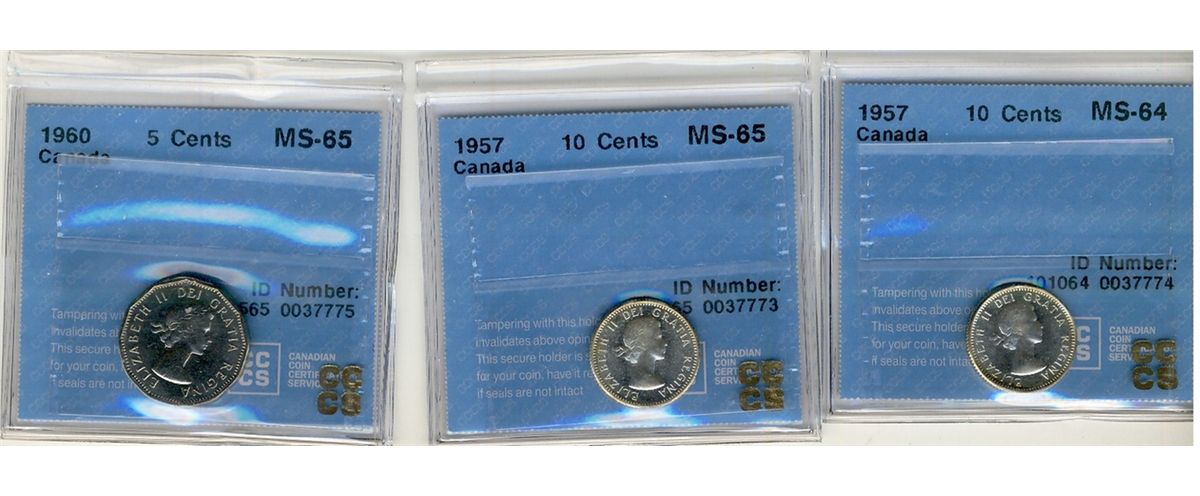 1957 10 Cents, MS64, MS65, 1960 5c MS65; Three CCCS coins.