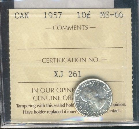1957 10¢ ICCS MS66. Crisp full white coin.