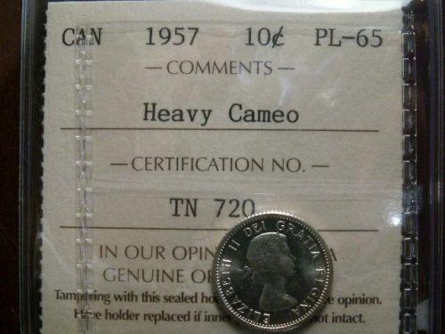 1957 10¢ ICCS PL65 HEAVY CAMEO. Full luster with reflective surfaces.