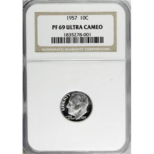 <B>1957 10C PR69 Deep Cameo NGC.</B></I> NGC Census: (13/0). PCGS Population (3/0). Numismedia Wsl. Price for NGC/PCGS coin in PR69: $625. (#95232)<BR><BR><b>Shipping:</b> Coins & Currency (<a target="_blank" href="http://www.heritageauctions.com/common/shipping.php">view shipping information</a>\)