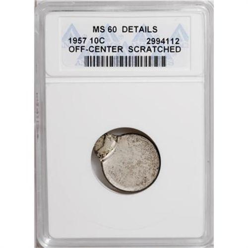 <B>1957 10C Mercury Dime--Scratched, Off Center--ANACS. MS60 Details.</B></I> <BR><BR><B>Coin Engraver:</B> John R. Sinnock<BR><BR><b>Shipping:</b> Coins & Currency (<a target="_blank" href="http://www.heritageauctions.com/common/shipping.php">view shipping information</a>)